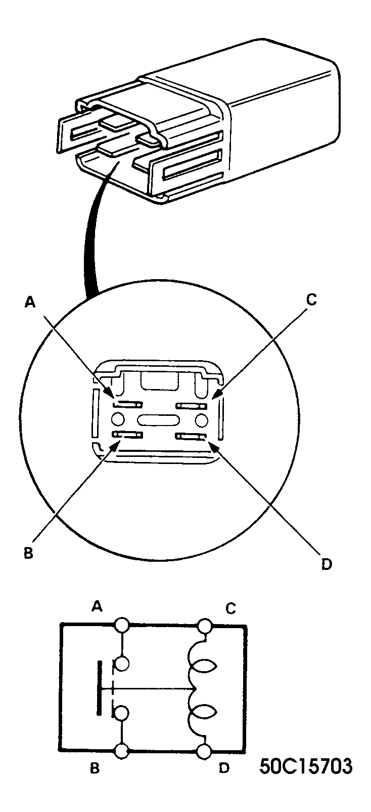 Remove power window relay from underhood fuse/relay box. Check for continuity between terminals "A" and "B" terminals when battery is connected to "C" and "D" terminals. Continuity should not exist when battery is disconnected. See Fig 1 .