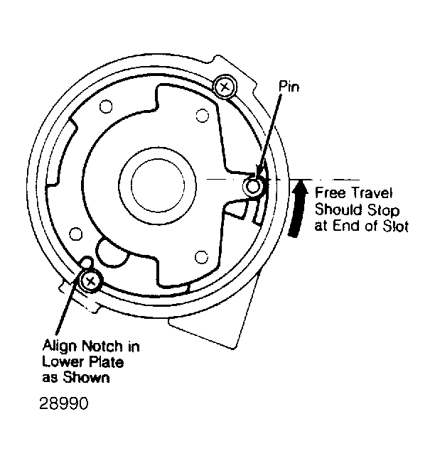 - Align breaker plate in distributor housing. See Fig 2. Ensure breaker plate moves freely. Be sure diaphragm arm attachment pin does not rotate past end of slot in lower plate.