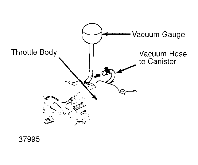 1. Start engine. Warm engine to normal operating temperature (when cooling fan comes on). Disconnect vacuum hose (to canister) from top of throttle body. Connect a vacuum gauge to throttle body. See Fig 1 . Engine speed should be set at idle.