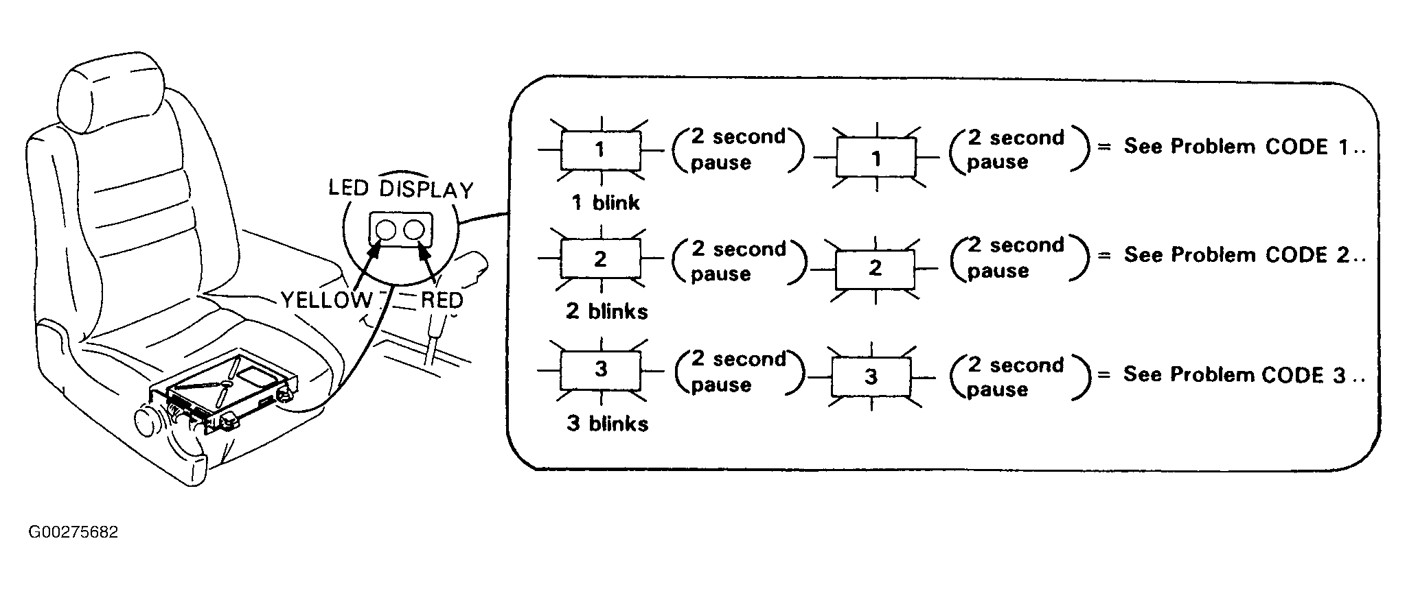 A Red LED light is located on ECU for self-diagnosis codes. There is also a Yellow LED light which is for idle speed adjustment and is not related to trouble shooting codes. The Red LED light is for codes set at component failure. See appropriate LED CODES table in this article. To obtain ECU codes, turn ignition switch to the "ON" position and watch ECU Red LED light. See Fig 1 . See COUPE LED CODES or SEDAN LED CODES table.