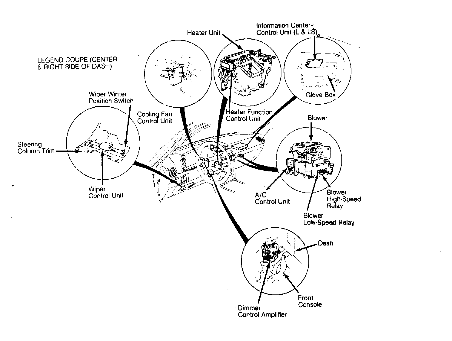 | Information Center Control Unit (Coupe) | Under right side of dash, behind glove box. See Figure . | |
