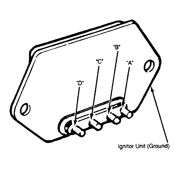 - Using an ohmmeter, check continuity in both directions between terminals "C" and "D" on ignitor output. See Fig 2. Continuity should be present in only one direction. Connect ohmmeter positive test probe to terminal "A" and negative probe to ignitor unit ground. Measure resistance of ignitor input. Ignitor input resistance is 50,000 ohms or more at 70°F (20°C).