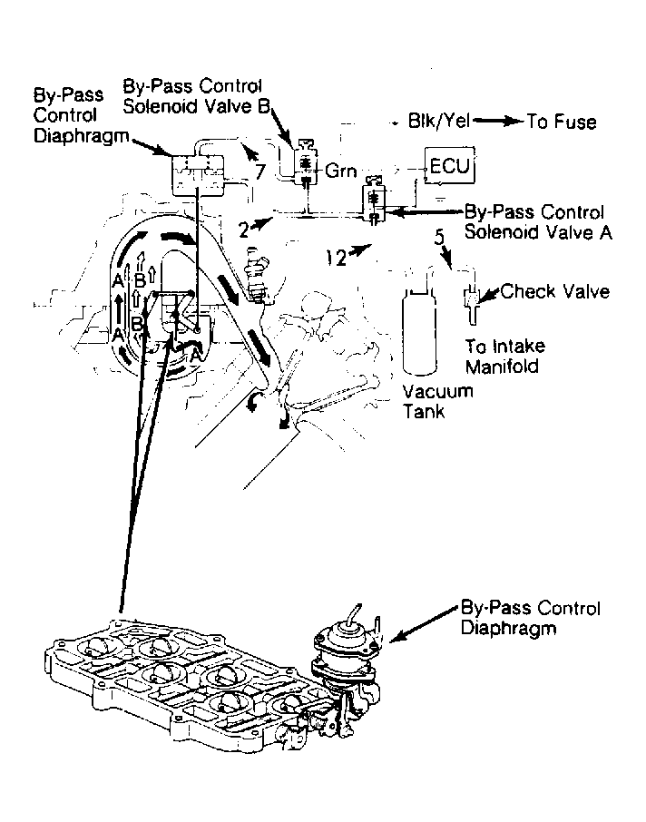 7. If vacuum is present at tank in step 3), disconnect solenoid connector at firewall. Measure voltage between Black/Yellow terminal and Red/Blue terminal. If battery voltage is present, replace by-pass control solenoid valve A. If no voltage is present, proceed to step 8).