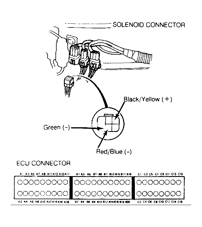 13. If no vacuum is present in step 5), disconnect solenoid connector at firewall. Check for battery voltage between Black/Yellow terminal and Green terminal. If battery voltage is present, replace by-pass control solenoid valve B. If no voltage is present, proceed to step 14).