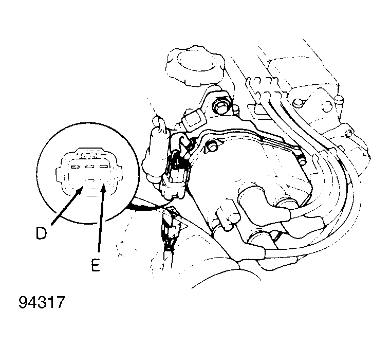 2. If light is on, turn ignition off. Disconnect 6-wire TDC/Crank sensor connector at distributor. Measure resistance between terminals D and E. See Fig 1 . If resistance is not 350-550 ohms, replace distributor assembly. If resistance is within specification, check for continuity between ground and terminals D and E. If continuity exists, sensor is shorted to ground. Replace distributor assembly.