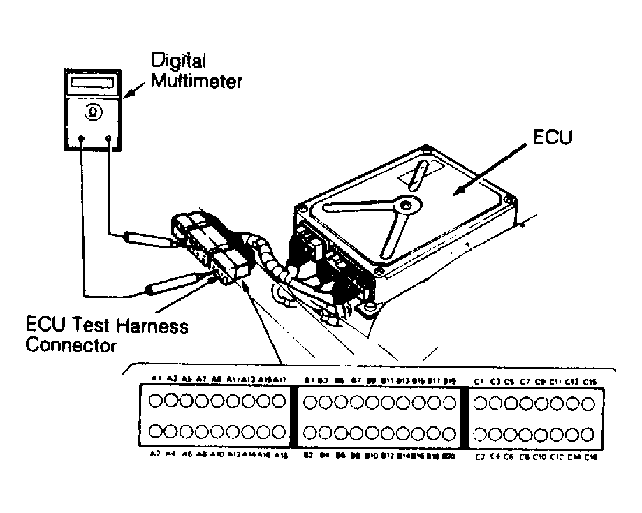 - Connect ECU test harness to main wiring harness side only. Measure resistance between ECU harness terminals C3 and C4. Refer to Fig. Figure . If resistance is not 350-700 ohms, repair open in Orange/Blue and/or White/Blue wire.