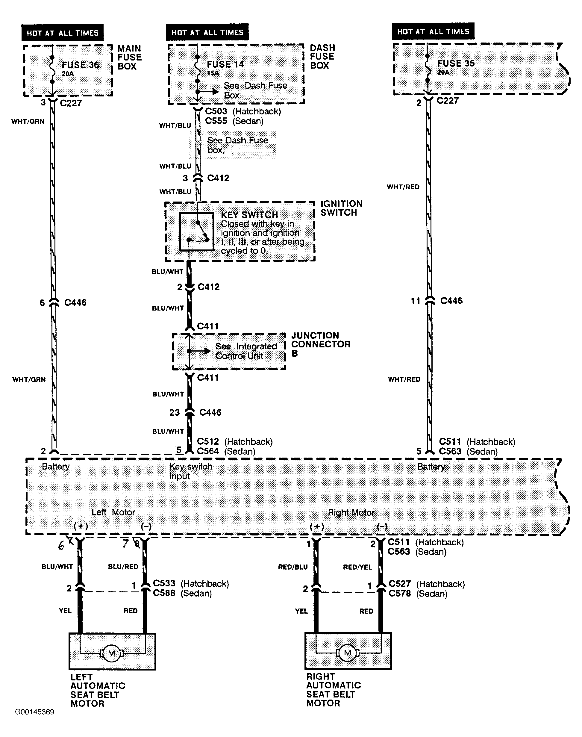 - Check for continuity between terminals No. 1 and 2. There should be no continuity when the shoulder buckle is in the front position. There should be continuity when the shoulder buckle is not in the front position.