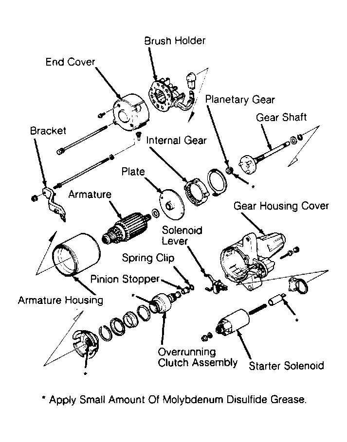 Legend models with either a Mitsuba or Nippondenso starter. See Figure and Figure . All starters are 4-brush, solenoid-actuated, gear-reduction type equipped with an overrunning clutch. The brush holder assembly retains brushes and springs in the starter housing. Manual transmission models use a starter relay and a clutch interlock switch. Automatic transmission models use a starter relay and a neutral safety switch. The starter relay is mounted on underdash fuse box.