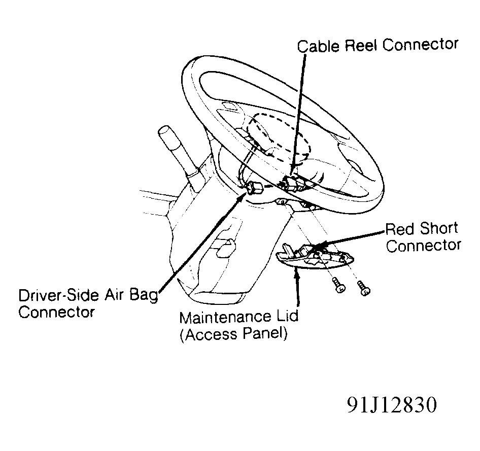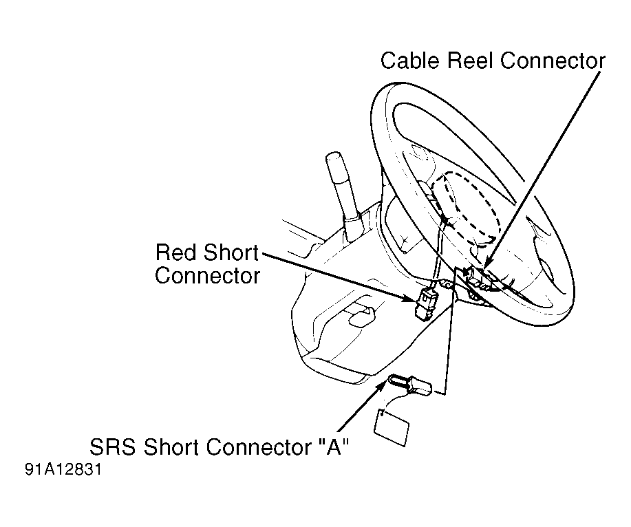 2. On all models, disconnect battery cables. Remove maintenance lid below driver-side air bag. See Fig 1 Remove Red short connector. Disconnect 3-pin connector between air bag and cable reel. Connect Red short connector to air bag side of connector. On coupe models, connect SRS Short Connector "A" (07MAZ-SP00200) to cable reel side of connector. See Fig 2.