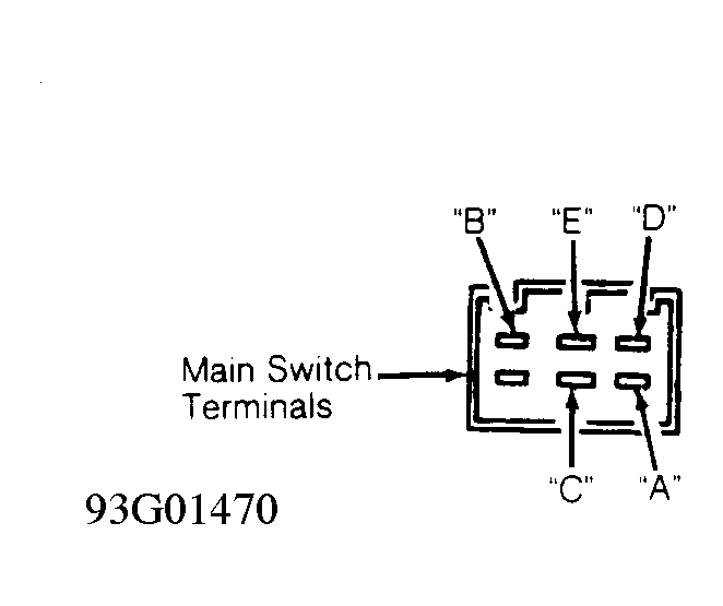. Continuity should be present. If continuity is present, main switch is okay. If continuity is not present, between main switch terminals "A" and "B", replace malfunctioning main switch. If continuity is not present between main switch terminals "B" and "C" and terminals "D" and "E", go to next step.