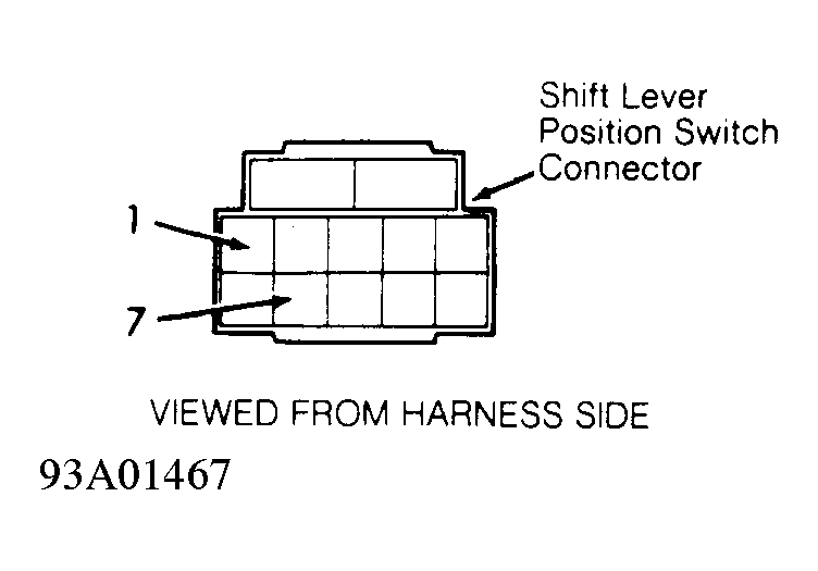 - Using a DVOM, check for continuity between shift lever position switch 10-pin connector terminals No. 1 and 7 with shift lever in "2", "S" and "D" positions. See Fig 1