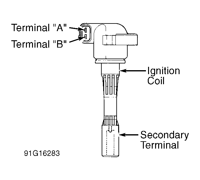 - Turn ignition off. Remove ignition coil. Using an ohmmeter, check resistance between primary terminals "A" and "B" of ignition coil. See Fig 1 .