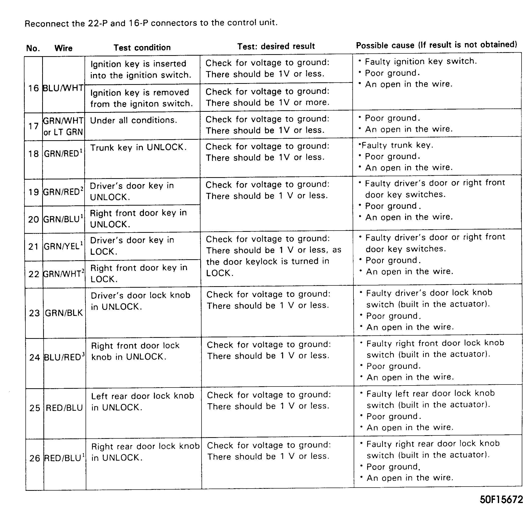 Remove driver's side instrument panel lower cover. Disconnect security system control module 16-pin and 22-pin connectors. Inspect connectors to ensure terminals are making good contact. If terminals are bent, loose or corroded, repair as necessary and recheck system. If terminals are okay, use a Digital Volt/Ohmmeter to perform SECURITY CONTROL MODULE INPUT TEST . See Fig 1 -Fig 6 . If input test is okay, replace control module.