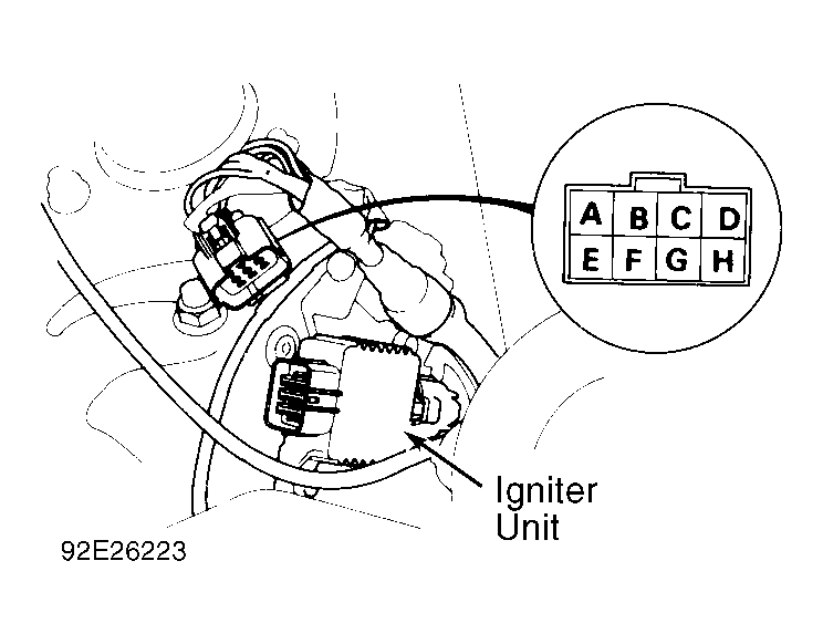- If Code 15 is present, turn ignition off. Disconnect 8-wire connector from ignitor unit. Using an ohmmeter, check for continuity between terminal "C" and terminal "F". See Fig 1 . If continuity is not present, repair open in Black wire(s) between ground terminal G102 and 8-wire connector.