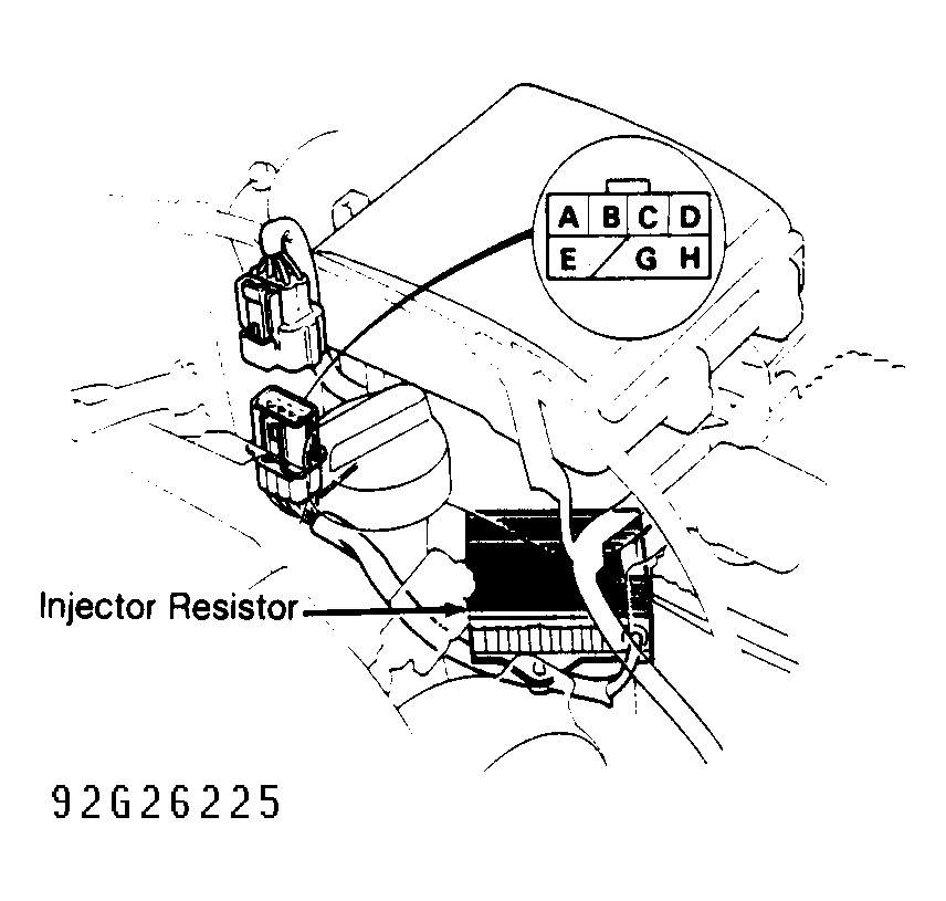 - Measure resistance between terminal "E" and all other terminals. See Fig 1 . If resistance is not 5-7 ohms, replace injector resistor. If resistance is 5-7 ohms, repair open in Red/Black wire between 2-pin connector and injector resistor.