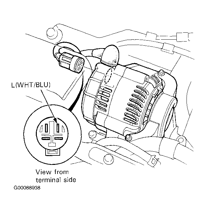 - Turn ignition switch on. The charge system light should come on. If it does not come on, disconnect alternator connector and short pin L (WHT/BLU) terminal to ground. See Fig 1 .