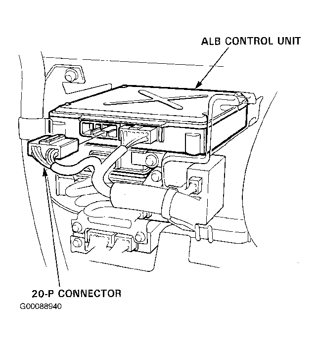 - Remove glove box and disconnect 20-P connector from ALB control unit. See Fig 3 . With engine running, charge system light should go off. If light goes off, there is a short in ALB control unit. If light does not go out, there is a short to ground in WHT/BLU wire between light and ALB control unit.