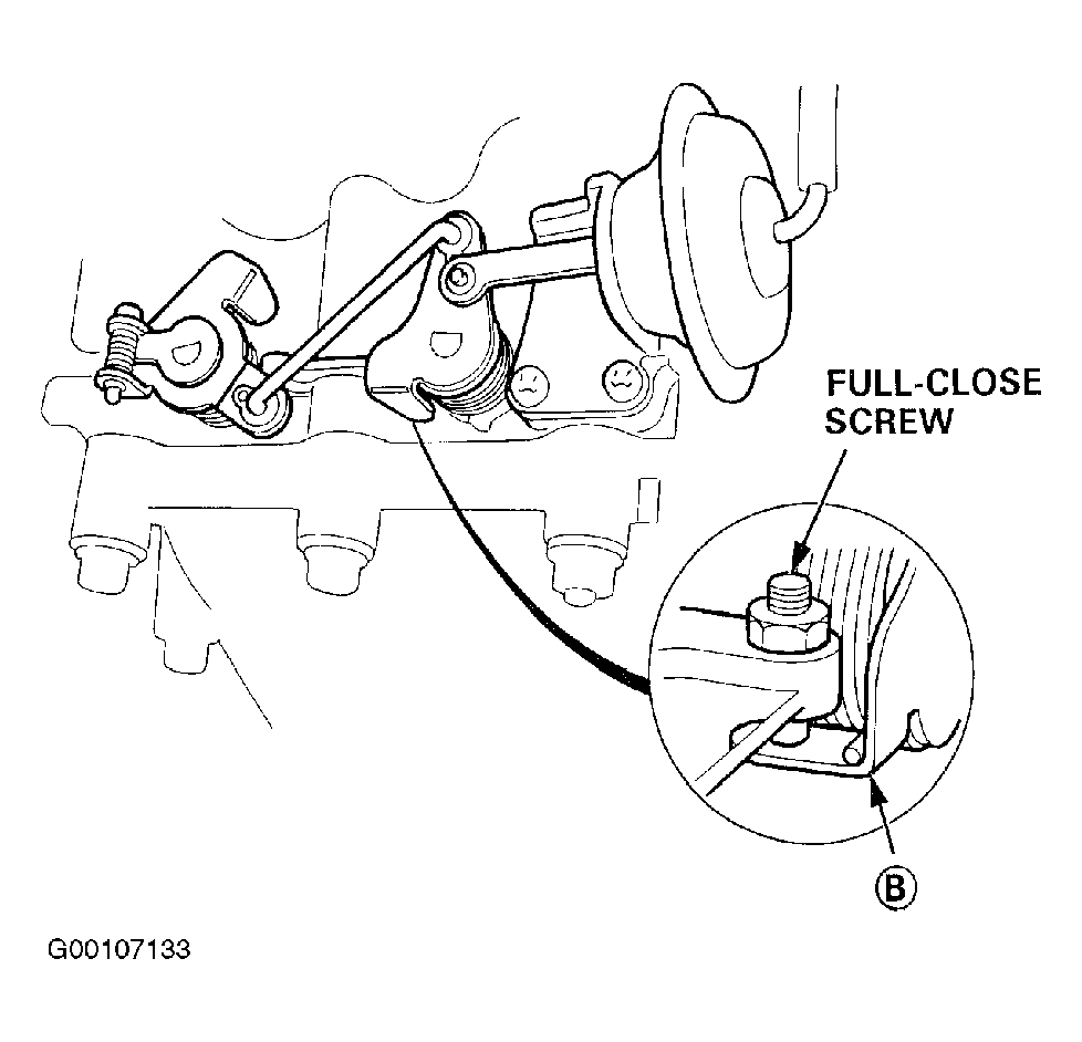 - Check that tab B of the chamber volume control valve is in close contact with the full-close screw when 15 in. Hg of vacuum is applied to the diaphragm. See Fig 5 .