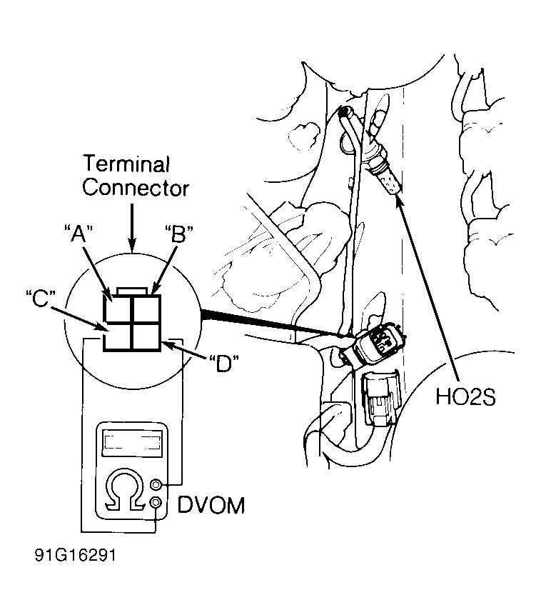 - Check continuity between body ground and O2 sensor terminals "C" and "D". If continuity is present, replace sensor. If continuity is not present, check for continuity between terminal "D" and terminals "A" and "B". See Fig 1