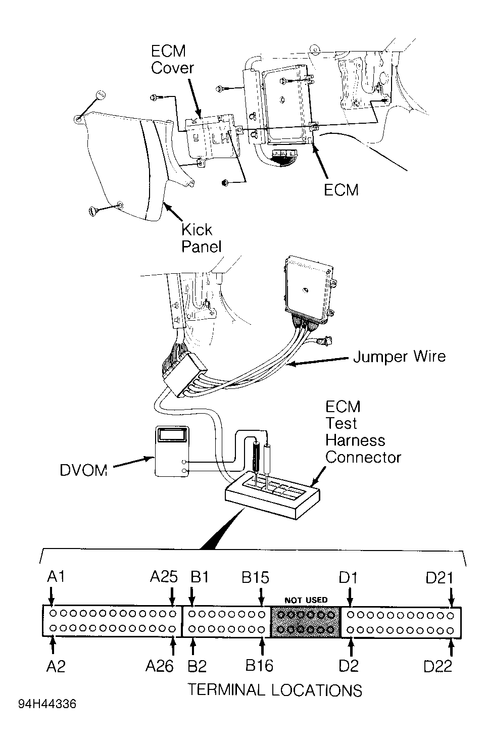 - Turn ignition on. Measure voltage between test terminals D11 (+) and D22 (-). Voltage should be about 0.5 volt at closed throttle and about 4.5 volts at wide open throttle. Transition from 0.5 to 4.5 volts (as throttle is opened) should be smooth. If voltage and operation is correct, replace ECM and retest.