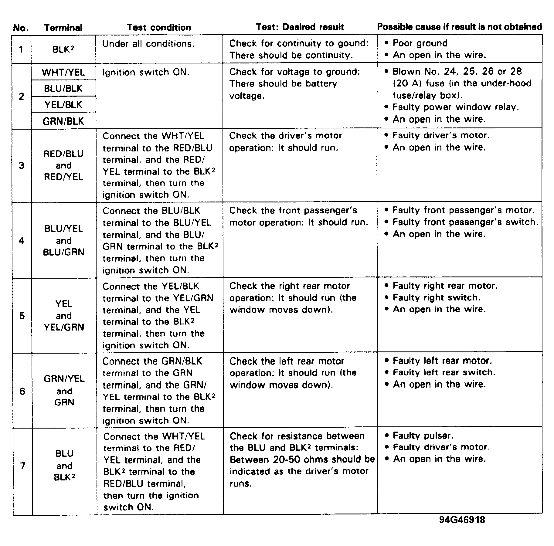 Turn ignition off. Remove driver's door panel. Unplug connectors from master switch. Using a DVOM, perform switch input tests in Fig 1 or Fig 2 . If all input test results are okay, inspect connector and terminals for damage and proper fit. If connector is okay and power windows still malfunction, replace master switch.