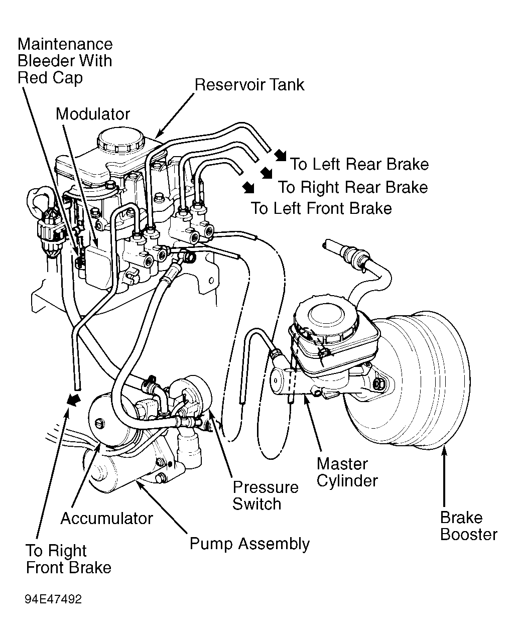 - Drain brake fluid from master cylinder and modulator reservoir. Remove Red cap from maintenance bleeder screw. See Fig 1 .