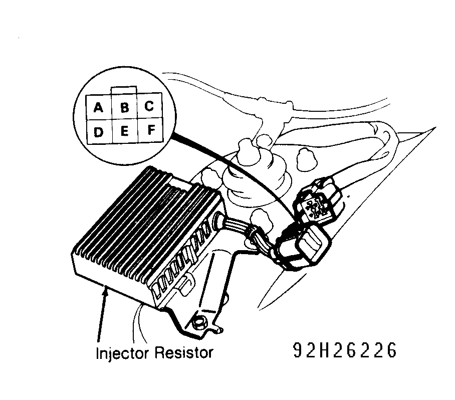 - Measure resistance between terminal "A" and all other terminals. See Fig 1 . If resistance is not 5-7 ohms, replace injector resistor. If resistance is 5-7 ohms, repair open in Red/Black wire between 2-pin connector and injector resistor.
