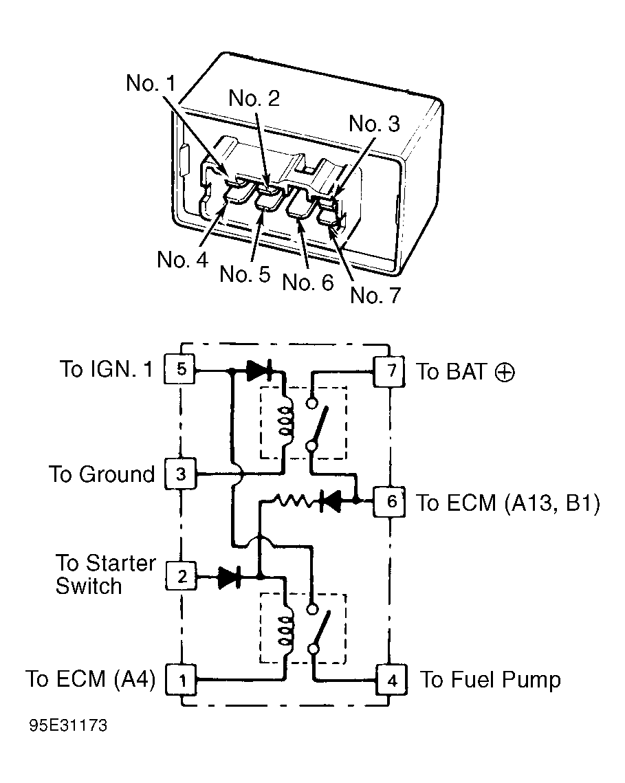 - Connect battery voltage to relay terminal No. 6. Connect terminal No. 1 to ground. Test for continuity between relay terminals No. 4 and 5. If continuity exists, relay is okay. If continuity does not exist, replace relay.