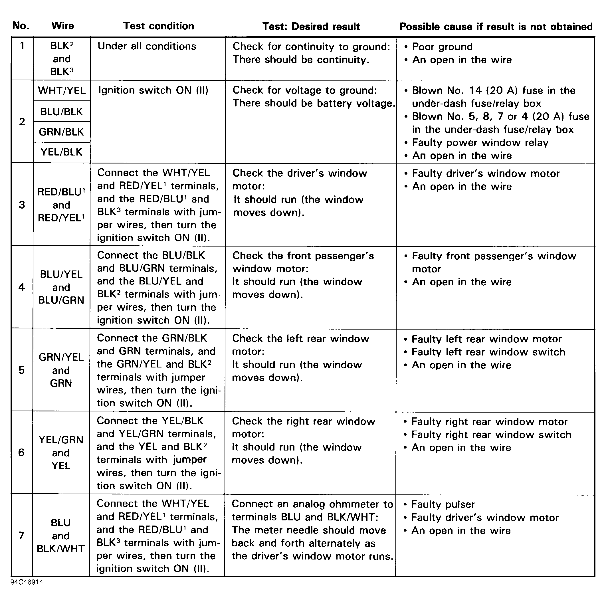Home >> Acura >> 1995 >> Integra GS-R, 2D Coupe >> Repair and Diagnosis >> Body & Frame >> Power Windows >> Component Tests >> Power Window Master Switch Input Test