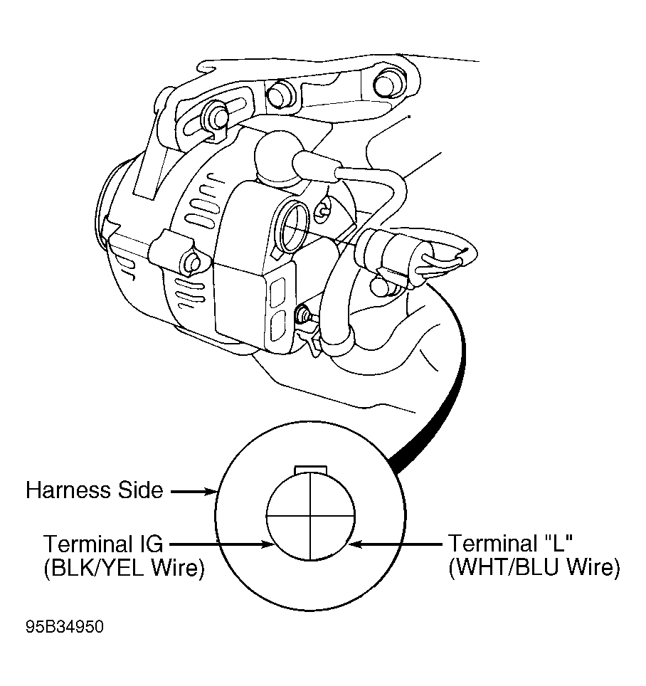- Return engine to idle and turn ignition off. Disconnect generator 4-pin harness connector. Turn ignition on. Measure voltage between ground and generator 4-pin harness connector terminal "IG" (Black/Yellow wire). See Figure. If battery voltage is present, replace voltage regulator. If battery voltage is not present, repair open in Black/Yellow wire.