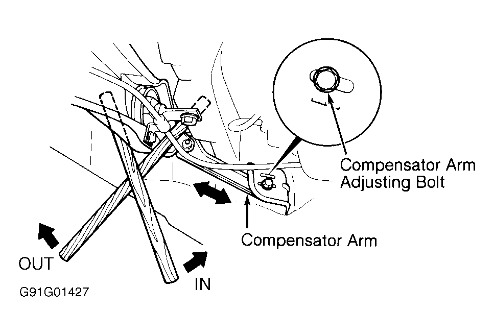 Release parking brake. If parking brake is engaged, toe reading may be incorrect. Note locations of right and left compensator arm adjusting bolts. See Fig 1 . Loosen adjuster bolt. Slide compensator arm in or out to adjust toe-in. See WHEEL ALIGNMENT SPECIFICATIONS . Tighten adjuster bolt. See TORQUE SPECIFICATIONS .