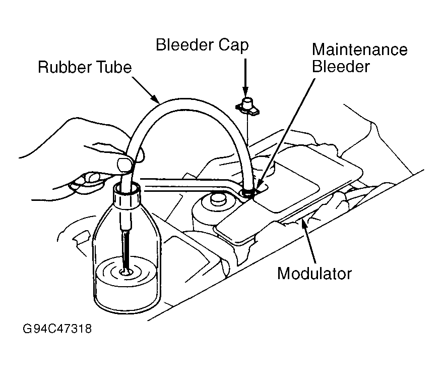 Remove bleed screw cap from maintenance bleed screw on modulator. See Fig 1 . Attach wrench to maintenance bleed screw. Connect a rubber tube of appropriate diameter to maintenance bleed screw, and place other end in a suitable container. Hold rubber tube, and slowly loosen maintenance bleed screw 1/8-1/4 turn to drain brake fluid from modulator. After fluid stops flowing, loosen bleed screw further to relieve pressure completely. Tighten bleed screw.