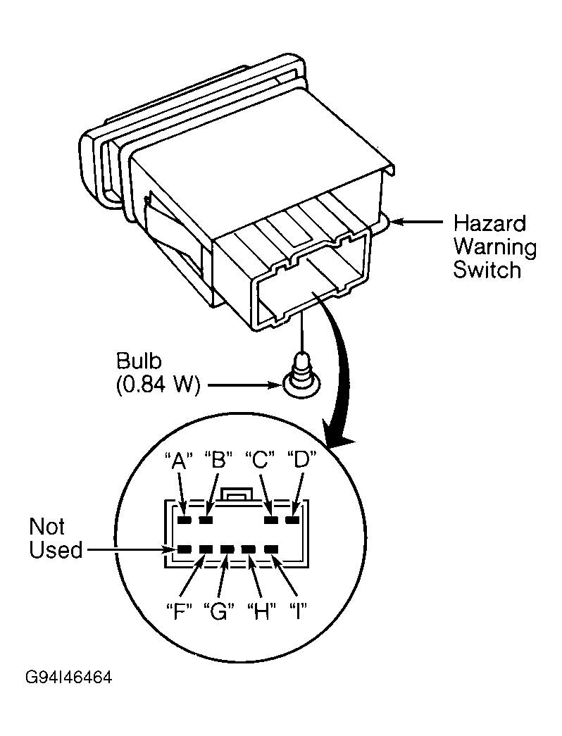 Remove hazard warning switch. With hazard switch in OFF position, ensure there is continuity between hazard switch terminals "C" and "I" and between "G" and "H". With hazard switch in ON position, ensure there is continuity between hazard switch terminals "D" and "I", between terminals "A", "B" and "F", and between terminals "G" and "H". If continuity does not exist between terminals "G" and "H", replace hazard switch indicator bulb. If hazard switch continuity is not as specified, replace hazard switch. See Fig 1 .