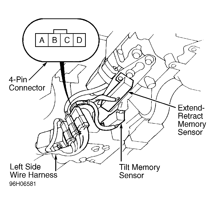 Remove steering column tilt cover. See STEERING COLUMN COVERS  under REMOVAL & INSTALLATION. Disconnect steering column memory sensor 4-pin connector. See Fig 1 . Using an ohmmeter, check resistance between sensor connector terminals is as specified in TILT/EXTEND-RETRACT MEMORY SENSOR TEST table. If sensor does not test as specified, replace faulty sensor.