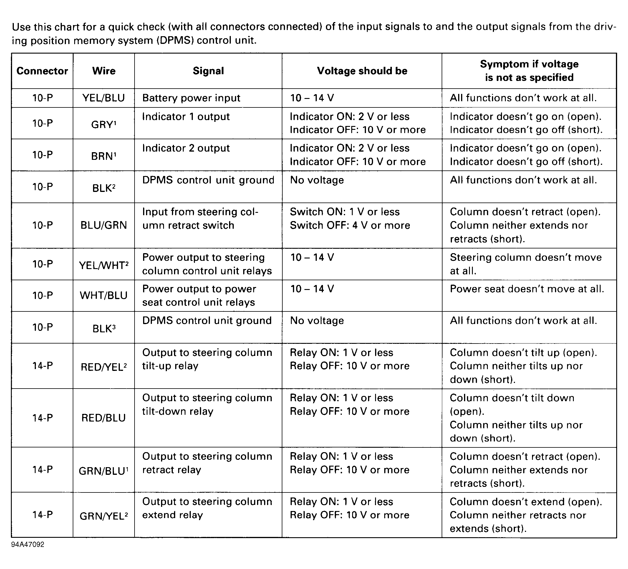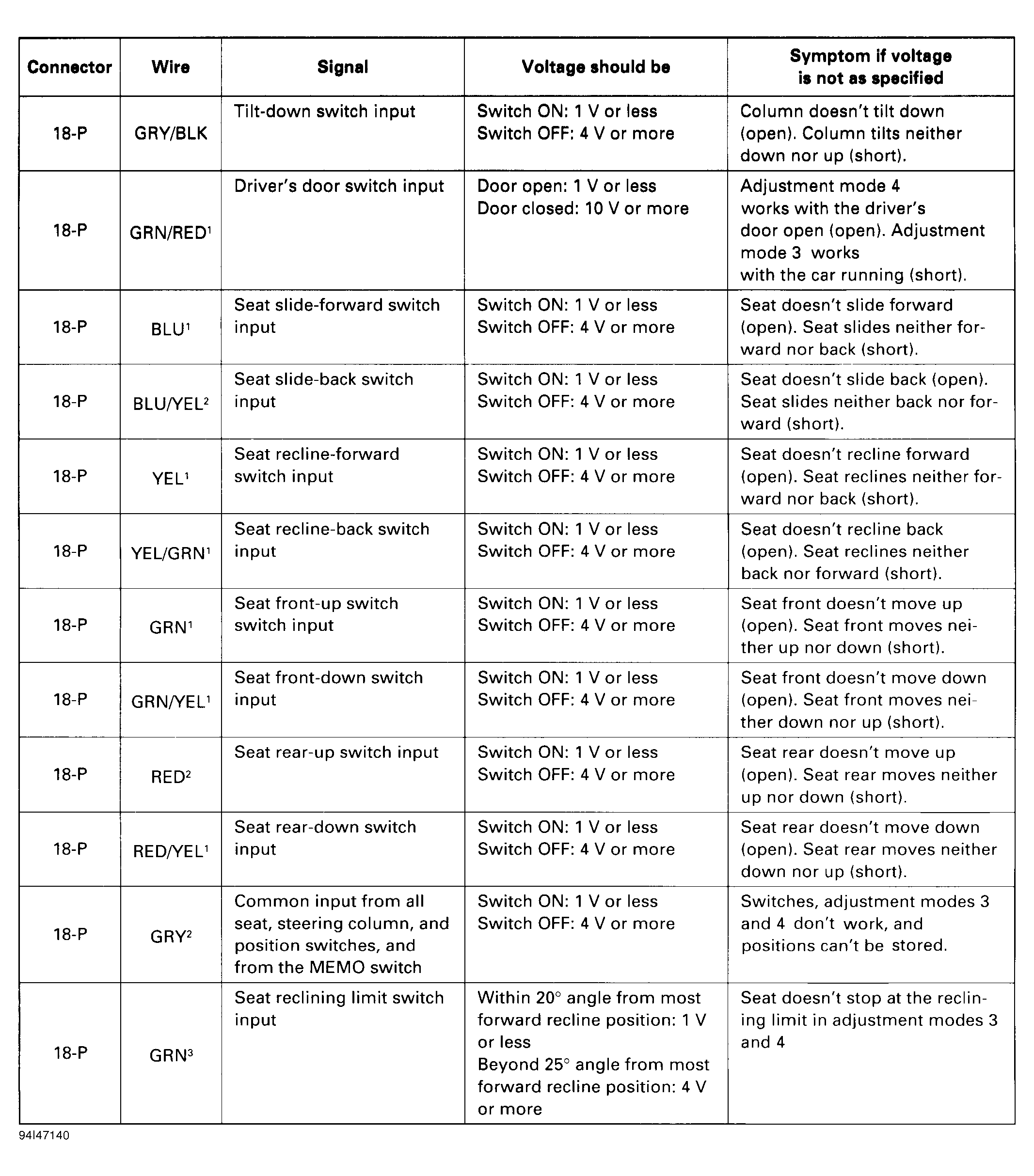 Home >> Acura >> 1995 >> Legend GS, Automatic >> Repair and Diagnosis >> Steering >> Steering Column >> Memory Systems >> Component Tests >> Driving Position Memory System Control Unit Inputs
