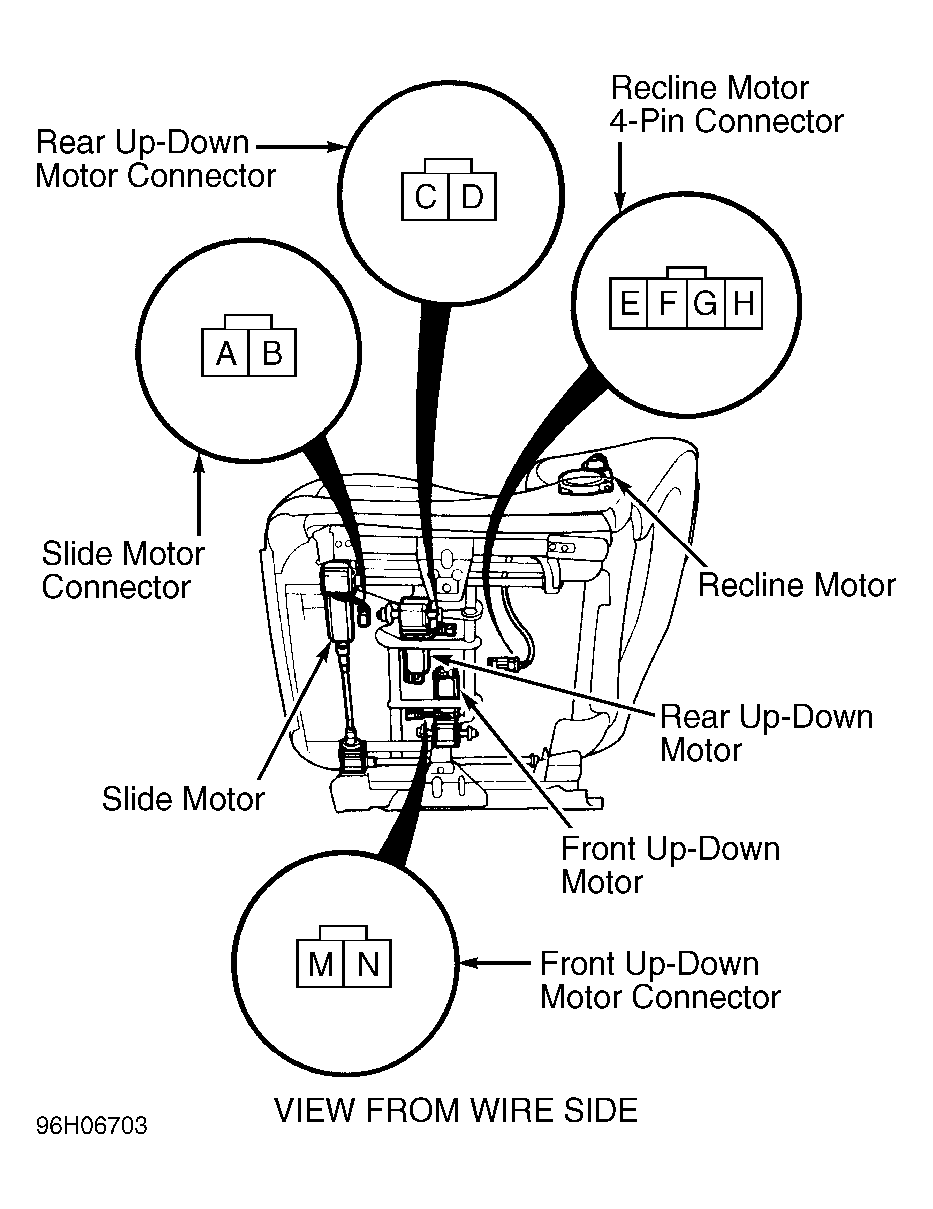 Remove driver's seat. See FRONT SEATS under REMOVAL & INSTALLATION. Disconnect all power seat motors/sensors. See Fig 1 . Connect battery power across motor leads. See Fig 2 . Using an analog ohmmeter, observe resistance across associated sensor terminals. Needle on ohmmeter should move from left to right. If motor does not run, reverse battery terminals. If motor still does not run, replace faulty motor. If ohmmeter needle does not move from left to right, replace faulty sensor. Repeat this procedure for each motor-sensor combination.