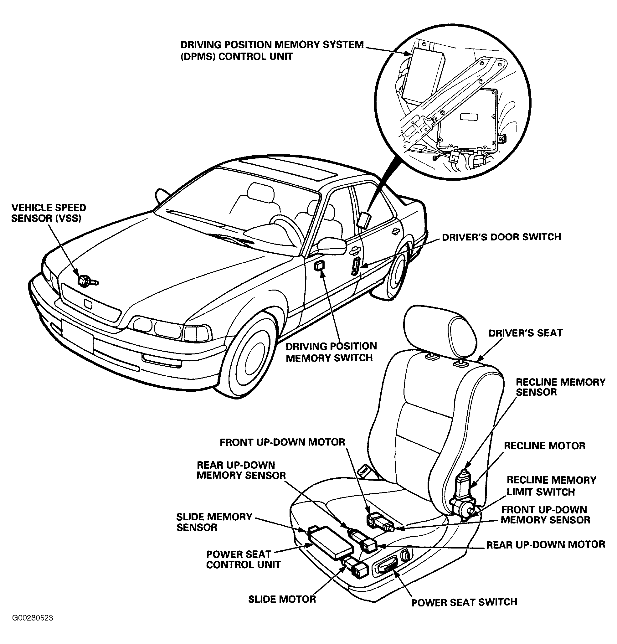 Fig 1: Identifying Power Seat Component Locations (Sedan Shown, Coupe Similar)