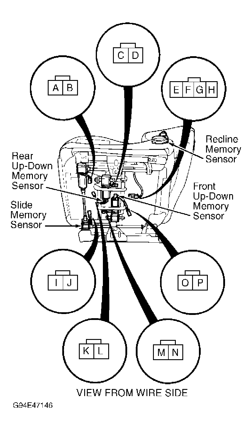 Remove driver's seat. Unplug connectors. Check for continuity between specified terminals with motor operating. Apply battery voltage between specified terminals (reverse leads if motor does not run). Resistance should increase smoothly as motor moves. Replace seat memory sensors if resistance is not as specified. See SEAT MEMORY SENSORS table. See Fig 1 .