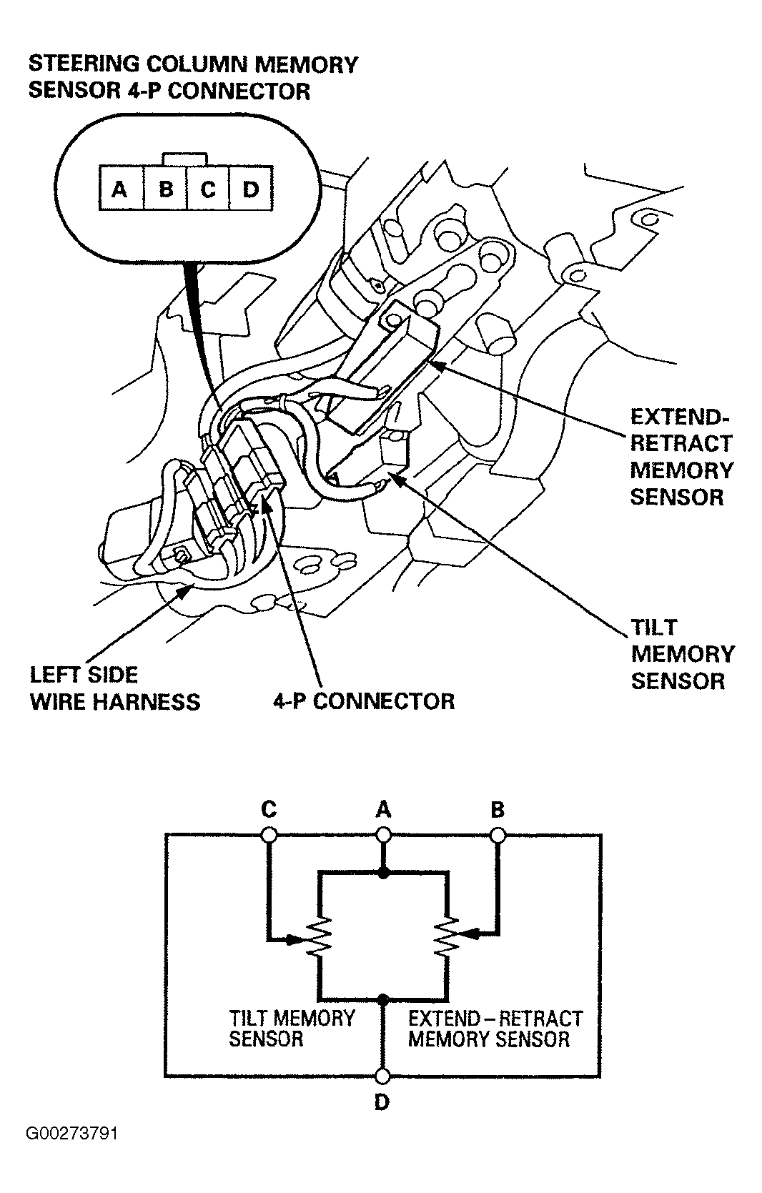 - Measure resistance between the sensor terminals. See TILT/EXTEND-RETRACT MEMORY SENSOR RESISTANCE table. See Fig 1 . If resistance is not as specified, replace steering column. See STEERING COLUMN (1994) or STEERING COLUMN (1995) article in STEERING.
