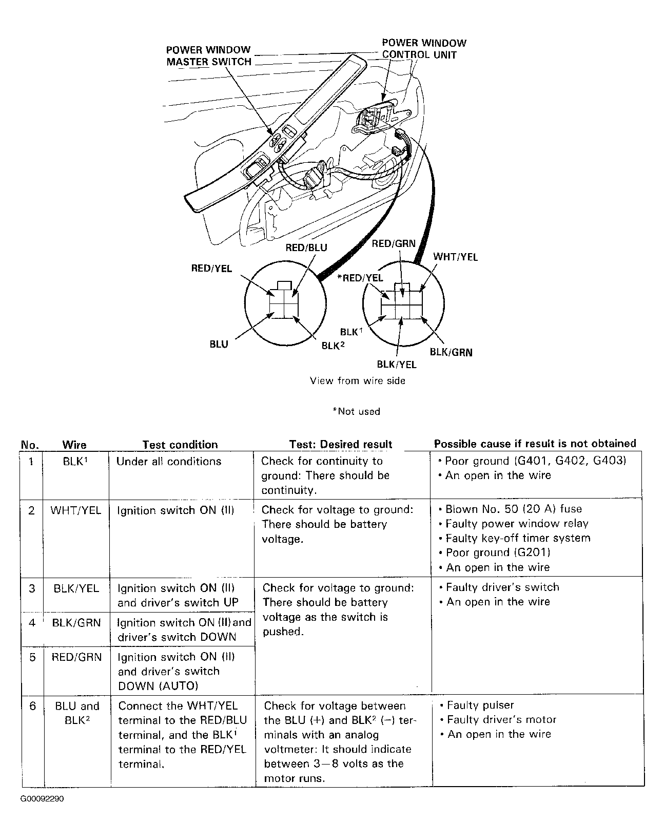 Remove the driver's door panel and disconnect the 4-P and 6-P connectors from the control unit. Inspect the connector and socket terminals to be sure they are all making good contact.