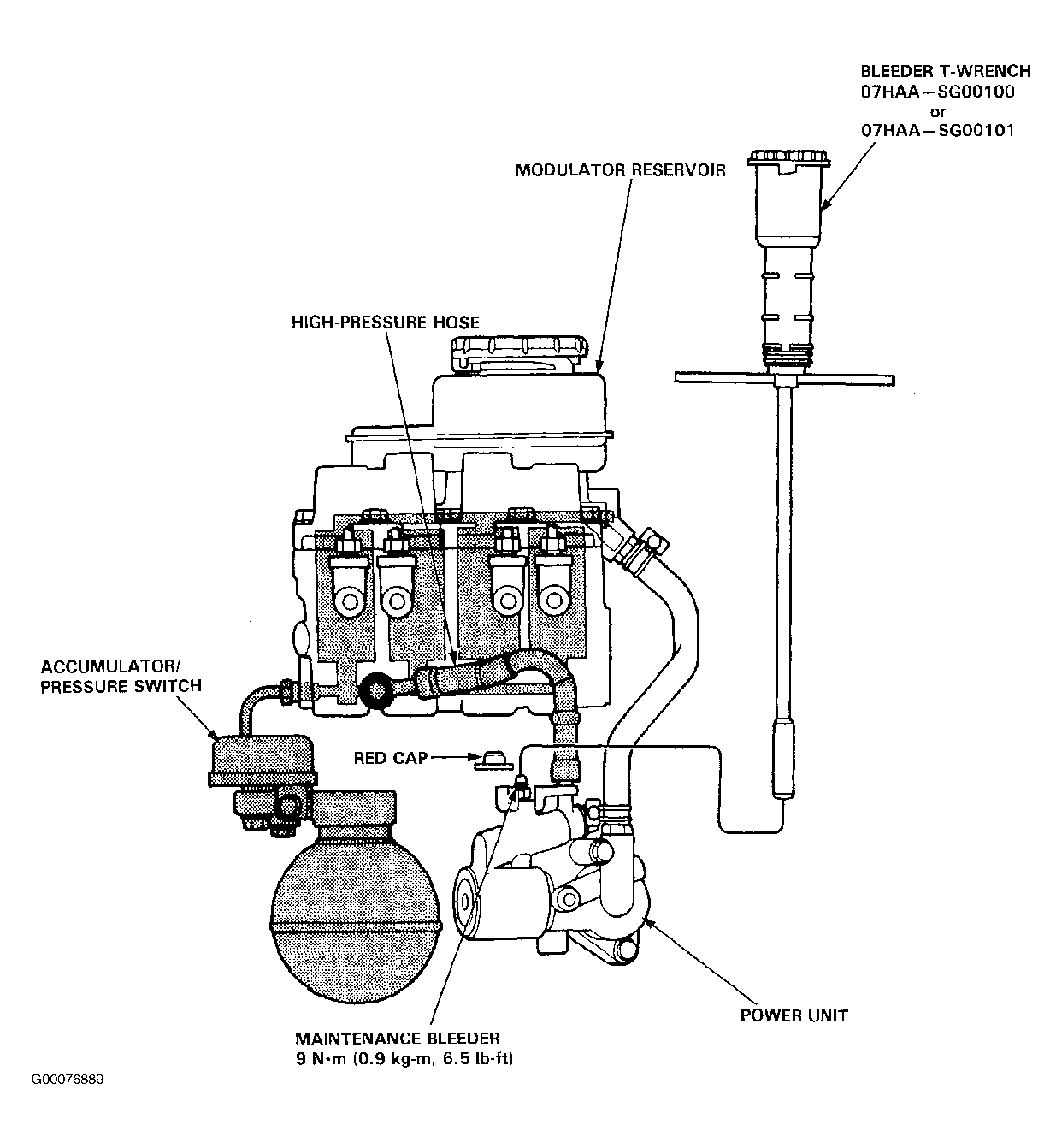- Bleed high-pressure fluid from maintenance bleed screw using Bleeder "T" Wrench (07HAA-SG00100 or 07HAA-SG00101). See Figure . Start engine and allow to idle. Release parking brake.