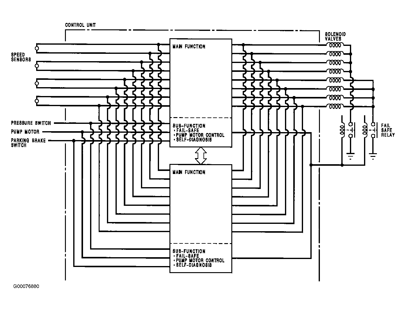 ABS control unit consists of a main function section, which controls operation of Anti-Lock Brake System (ABS), and sub-function, which controls the pump motor and self-diagnosis. The main function section of the ABS control unit performs calculations on the basis of signals from each speed sensor and controls operation of ABS by putting into action solenoid valves in modulator unit for each front and rear brake. The sub-function section gives driving signals to pump motor and also gives self-diagnosis signals, necessary for backing up ABS. See Figure .