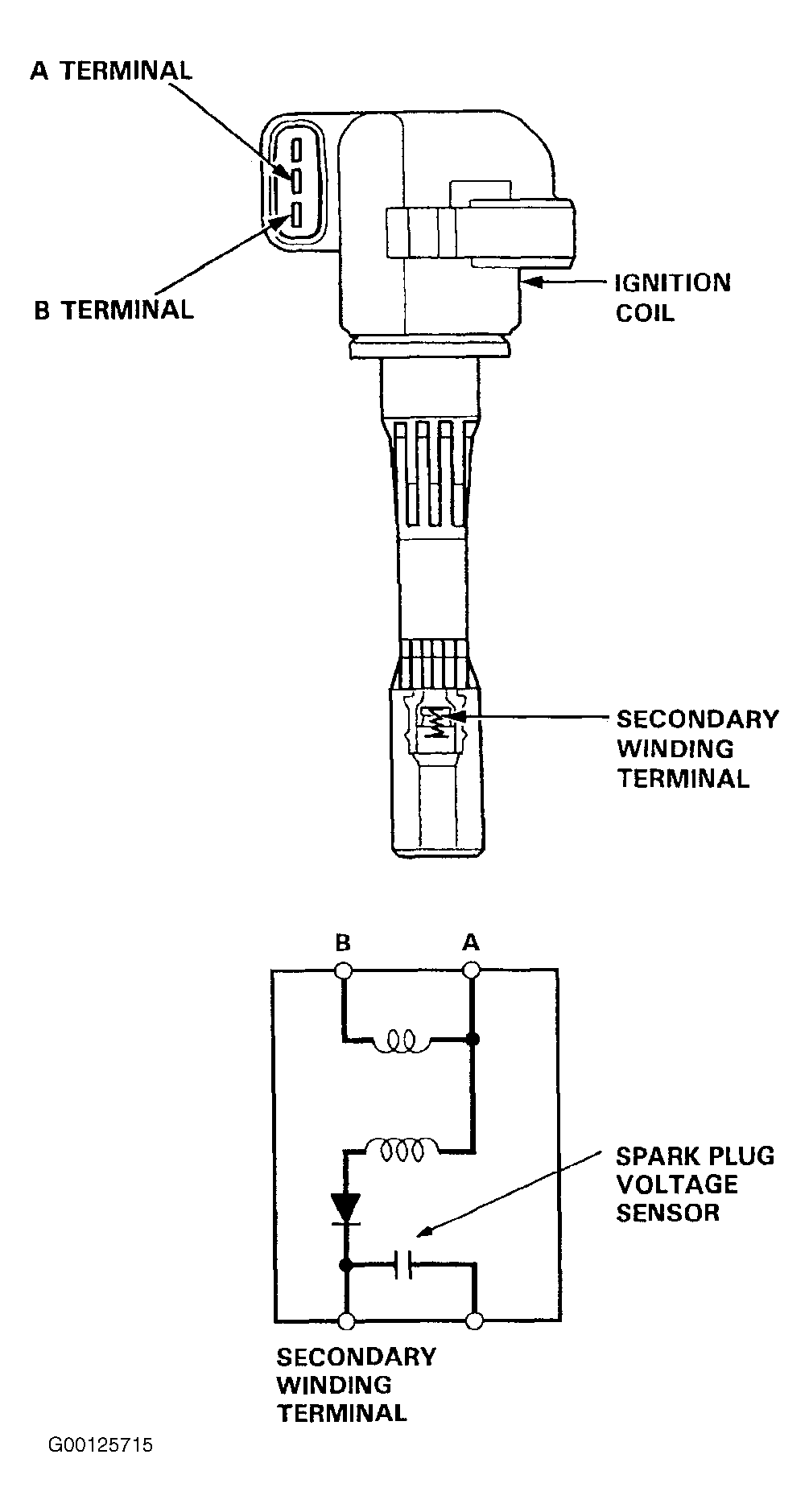 Turn ignition to OFF. Remove ignition coil and disconnect connector. Using ohmmeter, check primary resistance between coil terminal Nos. A and B. Resistance should be 0.9-1.1 ohms at 77° F (25° C). See Fig 1 .