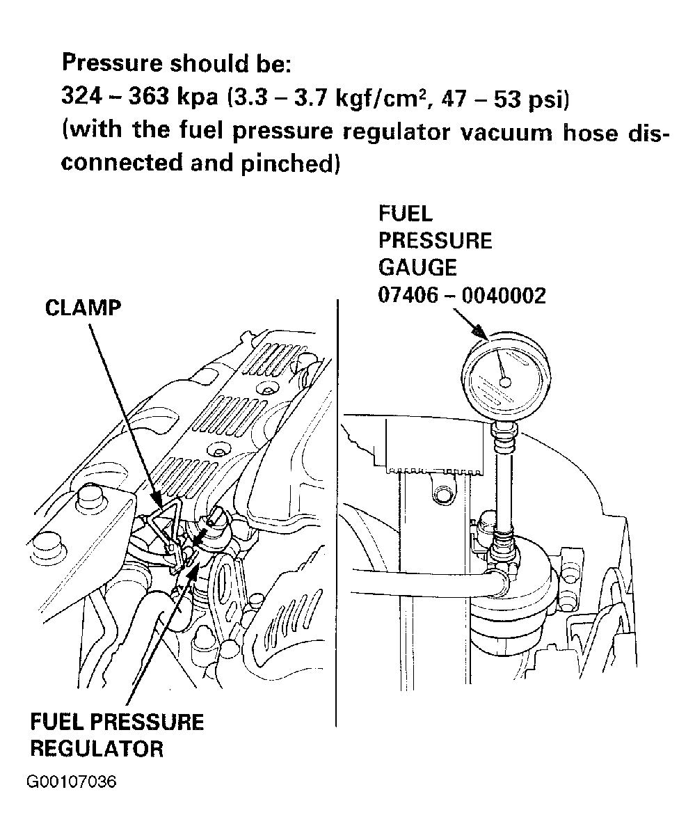 - Pressure should be 47-53 psi (323-363 kPa) with the regulator vacuum hose disconnected and pinched.
