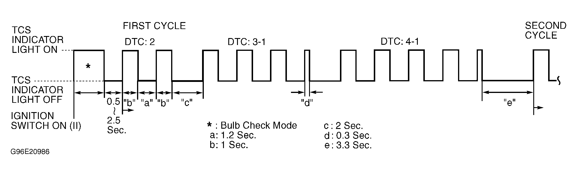 - After bulb check, TCS indicator light will turn off for 0.5-2.5 seconds, then begin indicating first DTC. See Fig 2 . Three different DTCs can be stored at once. TCS control unit will not store the same DTC more than one time. DTC cycles will be repeated after a 3.3 second pause. To recheck DTCs, turn ignition off and then turn it on again. After DTCs have been retrieved, clear DTCs. See CLEARING CODES . Perform test procedures in flow charts. See appropriate test under CIRCUIT TESTS .
