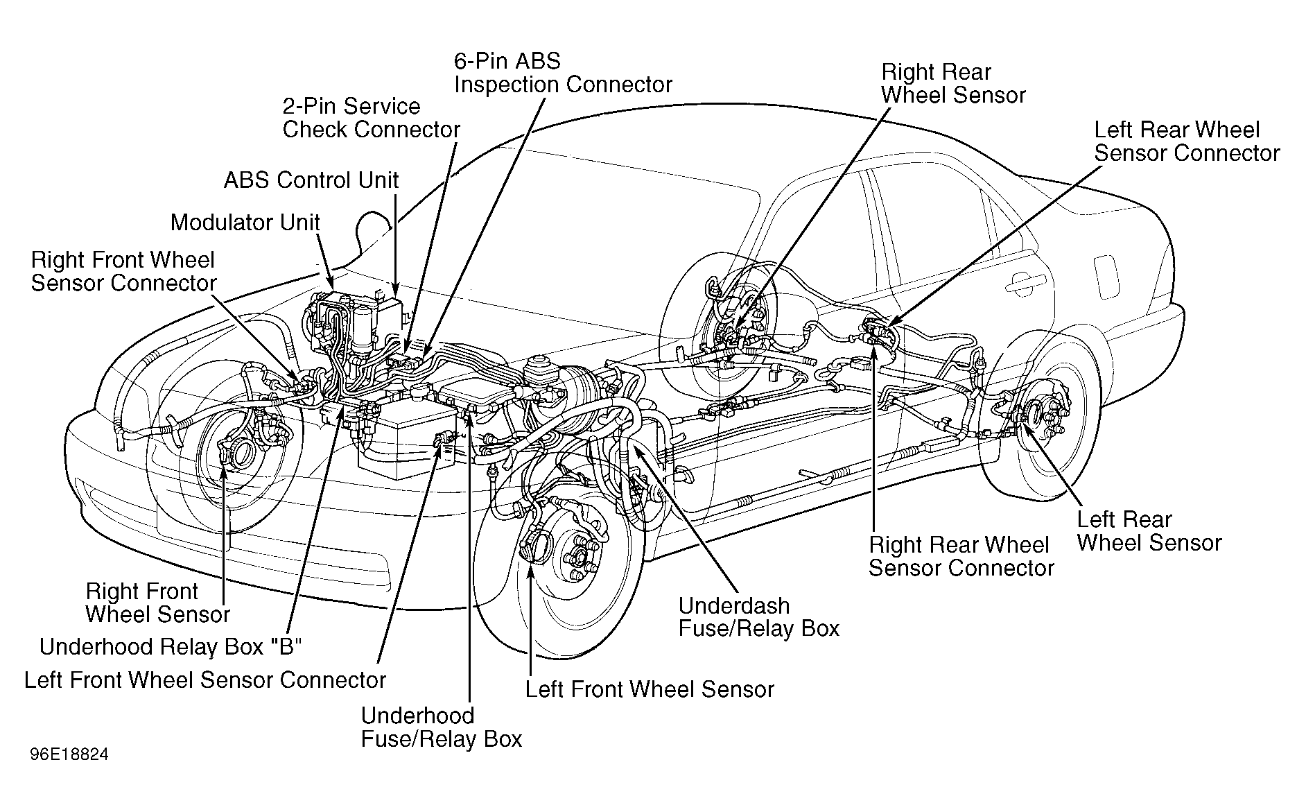 The Anti-Lock Brake System (ABS) is designed to prevent wheel lock-up during hard braking. This effect allows driver to maintain control of vehicle under severe braking conditions. System consists of ABS control unit, accumulator, pressure switch, pump assembly, wheel sensors, gear pulsers, modulator, warning light, master cylinder, power booster assembly, motor and fail-safe relays and connecting wiring. See Fig 1 .