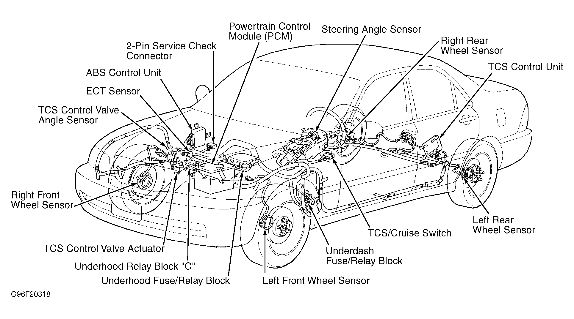 TCS control unit uses TCS control valve actuator (engine throttle control) and Powertrain Control Module (PCM) to reduce engine speed and power. TCS consists of wheel sensors, TCS control unit, TCS control valve actuator, TCS control valve sensor, steering angle sensor, TCS ACTIVE indicator and TCS OFF indicator. See Fig 1 .