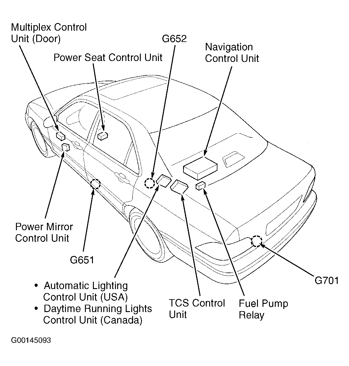 | Daytime Running Lamps Control Unit (Canada) | Behind left side of rear seat. See Figure . |