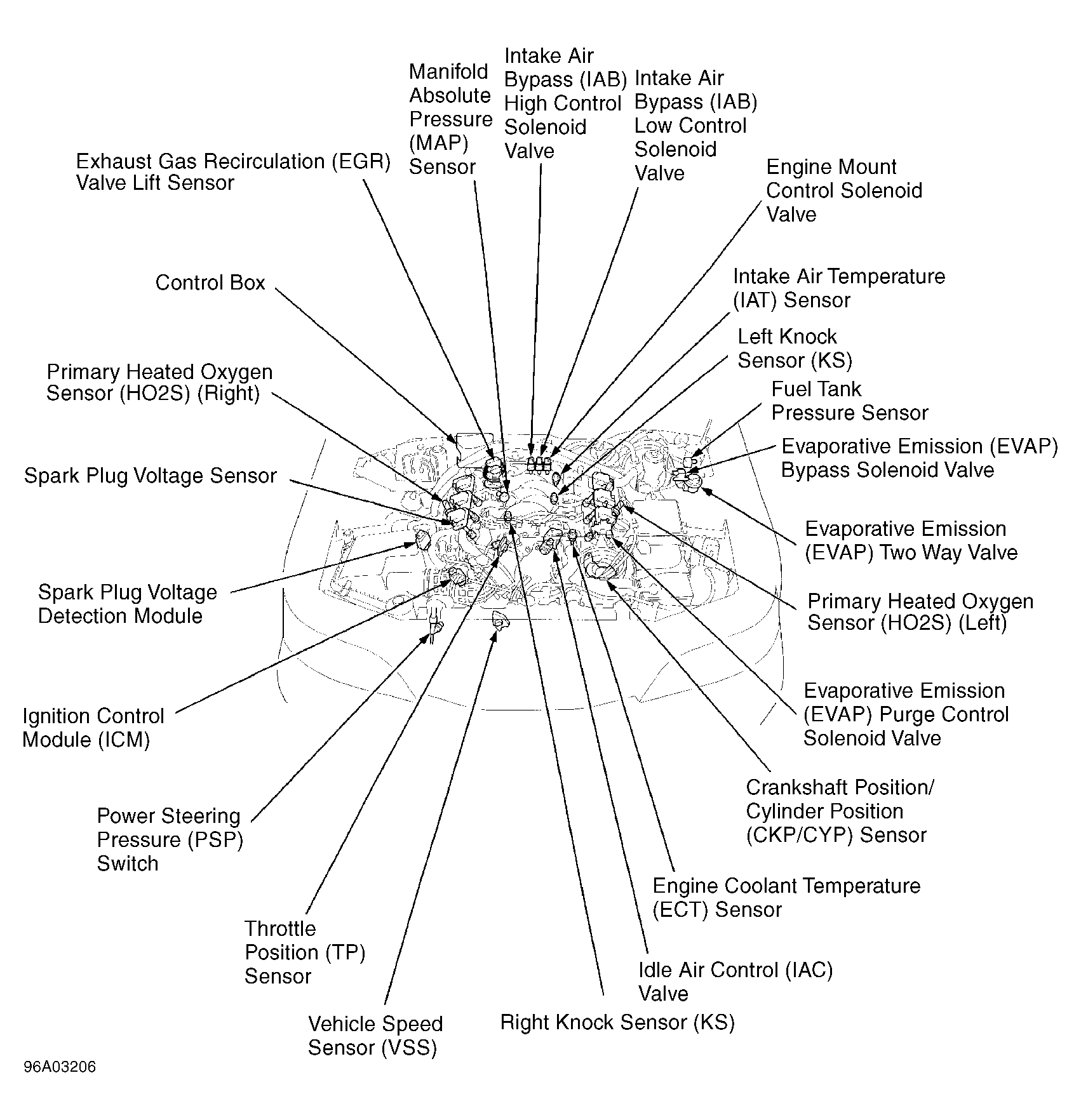 | Ignition Control Module (ICM) | Right rear of engine compartment. See Figure . |