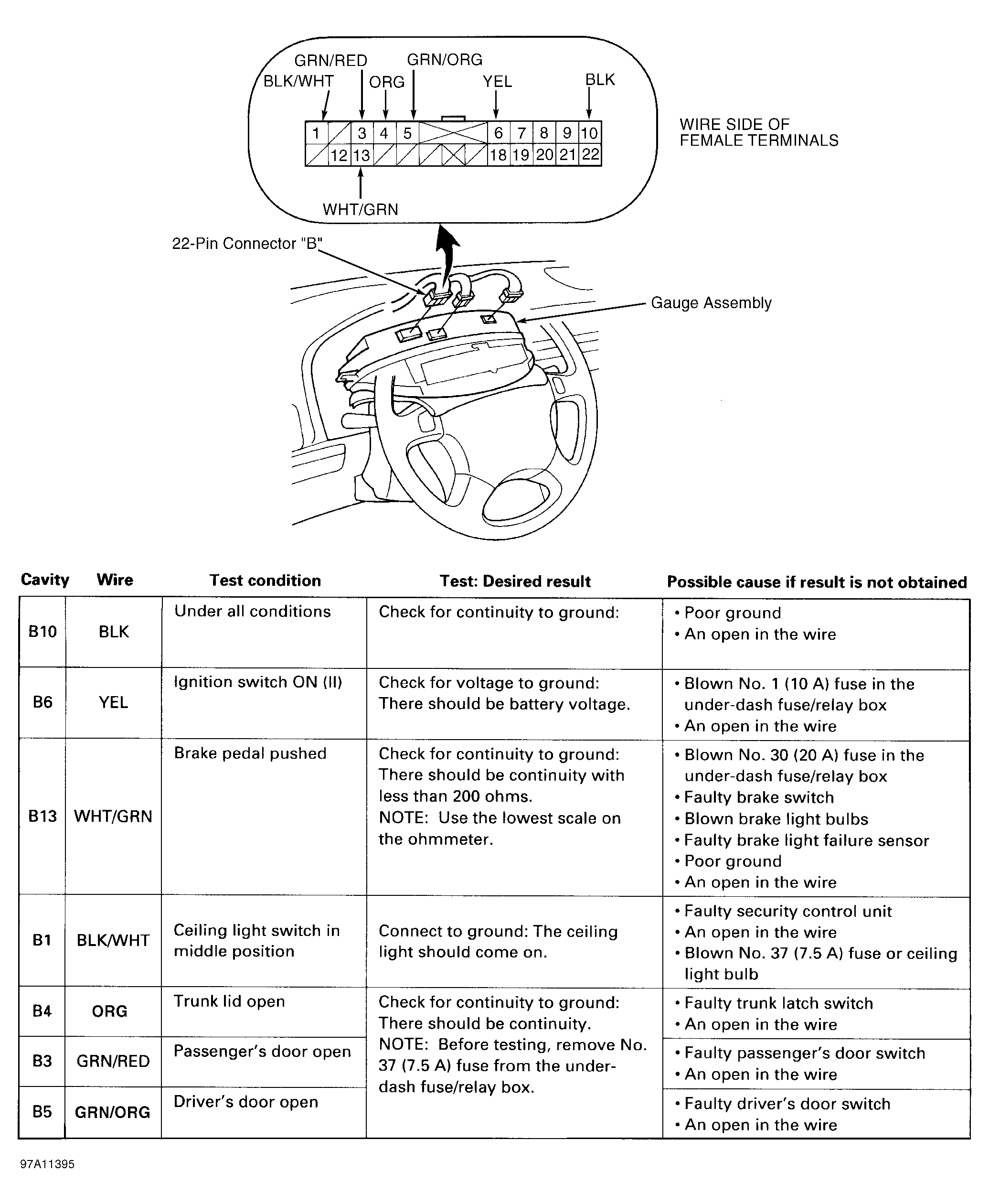 Disable air bag system. See AIR BAG RESTRAINT SYSTEM article. Remove instrument cluster from instrument panel. See INSTRUMENT CLUSTER under REMOVAL & INSTALLATION. Disconnect instrument cluster 22-pin "B" connector. Check for bent, corroded, loose or disconnected terminals in connector. Repair connectors as necessary and recheck system. See WIRING DIAGRAMS. If all safety indicator input tests are okay, replace instrument cluster printed circuit board. See Fig 1 . See WIRING DIAGRAMS.